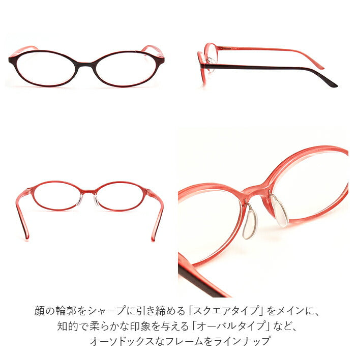 ・洗練されたシェイプが顔の輪郭をシャープに引き締める「スクエアタイプ」(Marbleシリーズ)をメインに、知的で柔らかな印象を与える「オーバルタイプ」(PinkBrownシリーズ)など、オーソドックスなフレームをラインナップ。