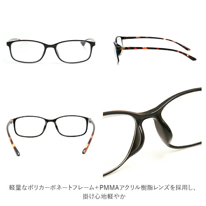 ・軽量なポリカーボネートフレーム+PMMAアクリル樹脂レンズを採用し、掛け心地軽やか。