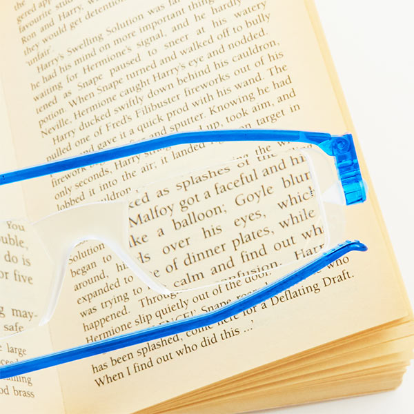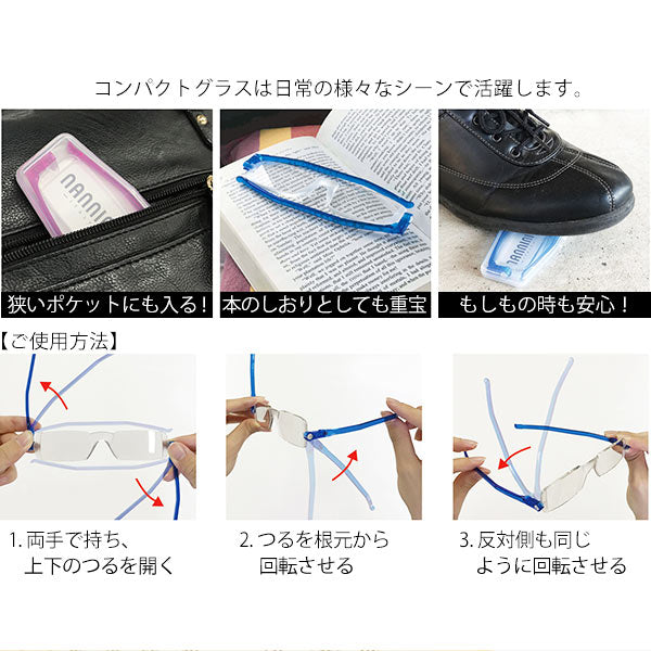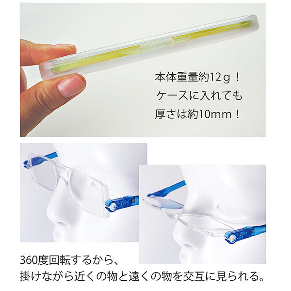つるを上下に折りたためて、コンパクトな折り畳み老眼鏡、シニアグラス。重さも10グラム前後で、かけているのを忘れるほど軽く、レンズも小さすぎないので実用的。薄いのでバッグなどでもかさばらず持ち歩ける。