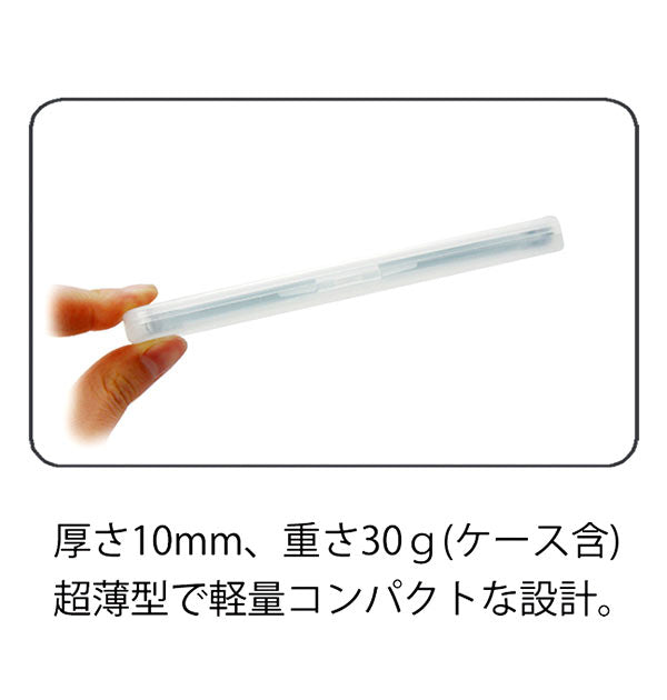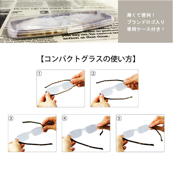 つるを上下に折りたためる、コンパクトな折り畳み老眼鏡。重さも10グラムと軽く、かけていることを忘れるほど。レンズも小さすぎないので実用的。薄いのでバッグなどでもかさばらず持ち歩ける。