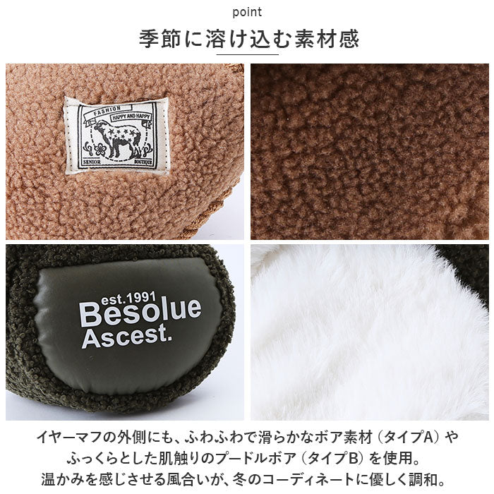・イヤーマフの外側にも、ふわふわで滑らかなボア素材(タイプA)やふっくらとした肌触りのプードルボア(タイプB)を使用。温かみを感じさせる風合いが、コートやマフラーなど冬のコーディネートに優しく調和。