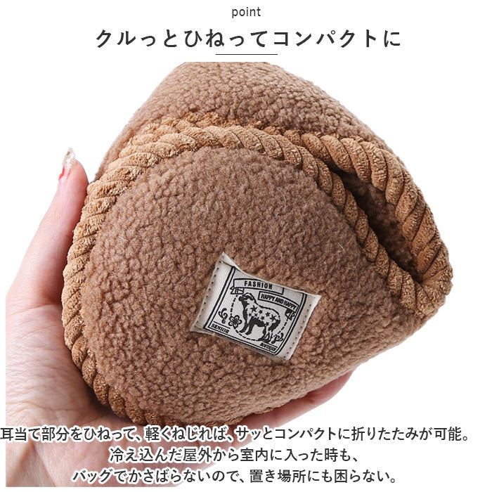 ・耳当て部分をひねって、軽くねじれば、サッとコンパクトに折りたたみが可能。冷え込んだ屋外から室内に入った時も、バッグの中に入れてコンパクトに収納できてかさばらないので、置き場所にも困らない。