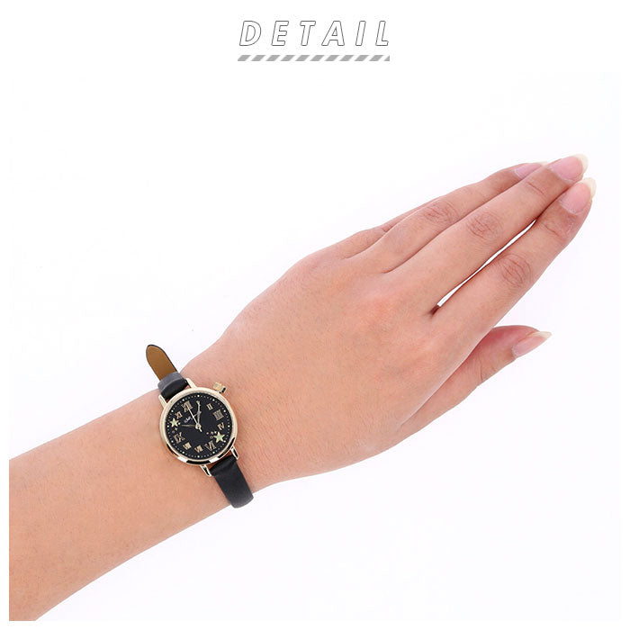・文字盤に描かれた星柄部分は蓄光のプリントを採用していて、夜になると光るのがポイント。