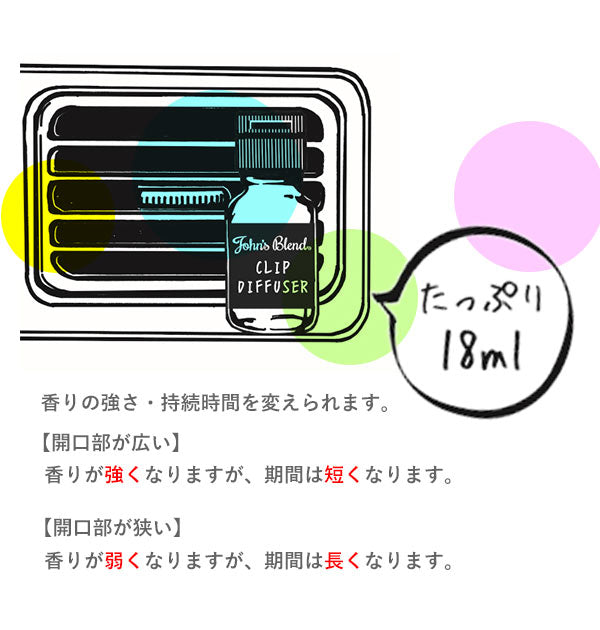 取付け方は簡単です!瓶本体にクリップパーツを取り付け、吸水芯付きのフタを取り付けて、車内のエアコンルーバーに取り付けるだけ!カーフレグランス用に特別に調香された新鮮なアロマオイルのここちよい香りが、送風とともに車内いっぱいに広がります。