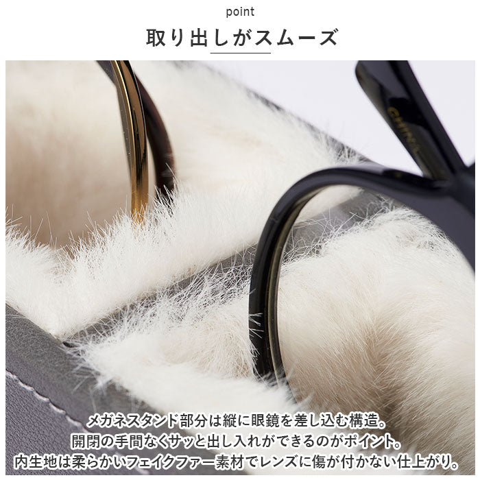 ・メガネスタンド部分は縦に眼鏡を差し込む構造。開閉の手間なくサッと出し入れができるのがポイント。