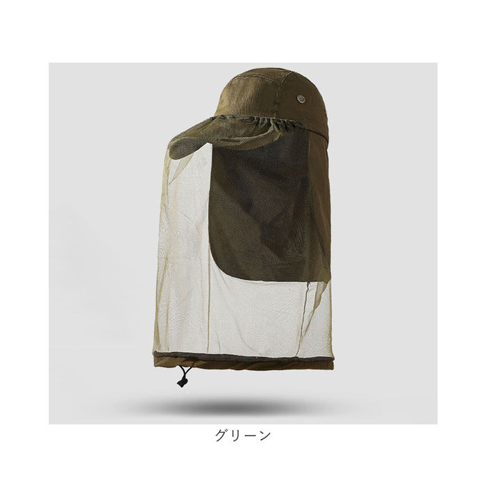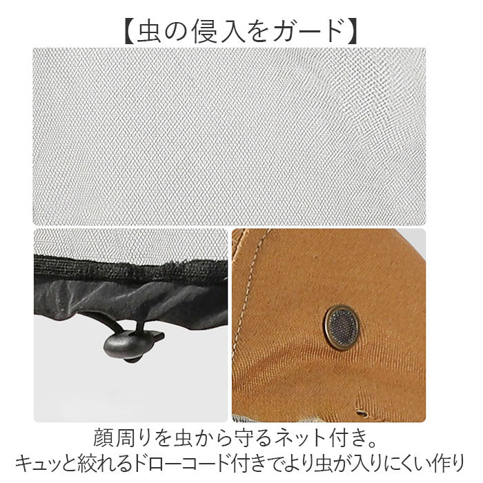 ・顔周りを虫から守るネット付き。キュッと絞れるドローコード付きでより虫が入りにくい作り