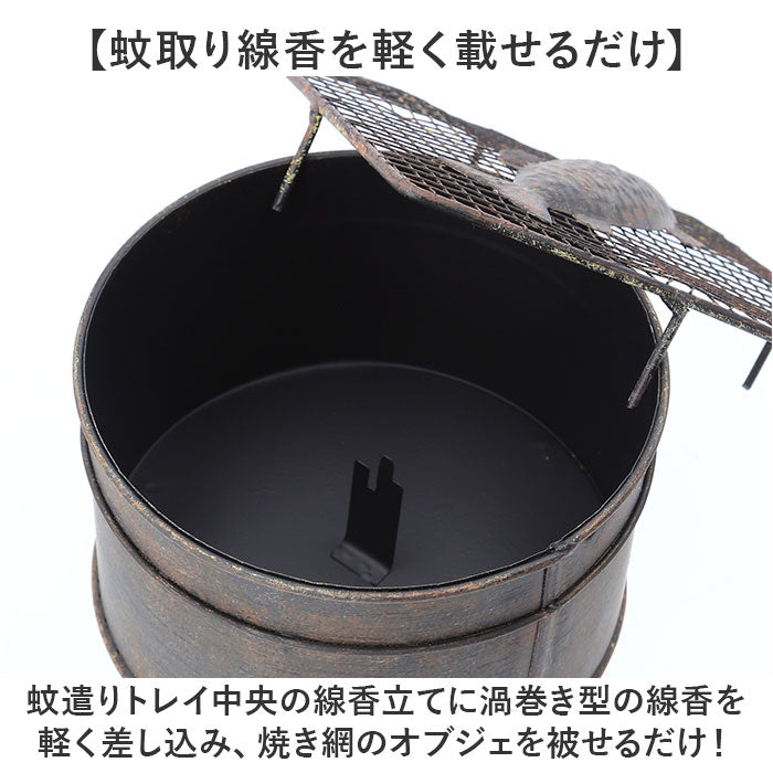 ・蚊遣りトレイ中央の線香立てに渦巻き型の線香を軽く差し込み、焼き網のオブジェを被せるだけ!