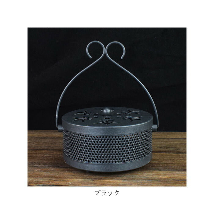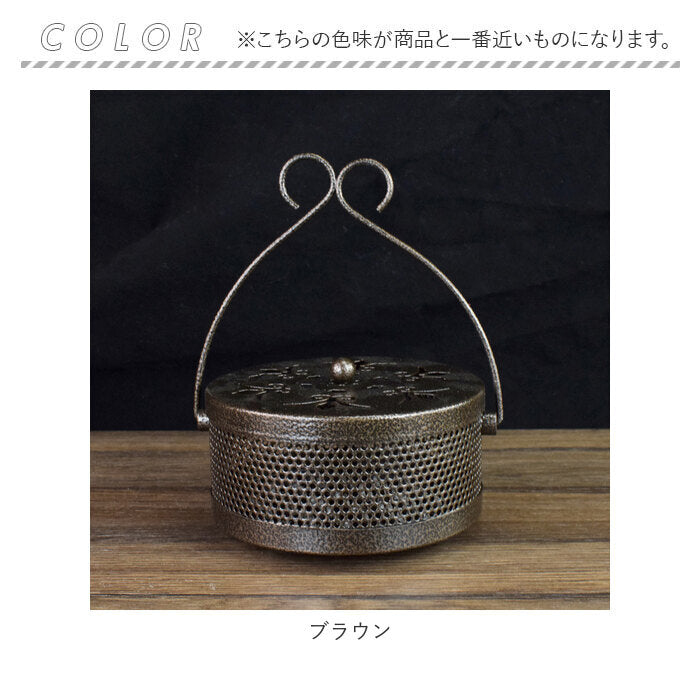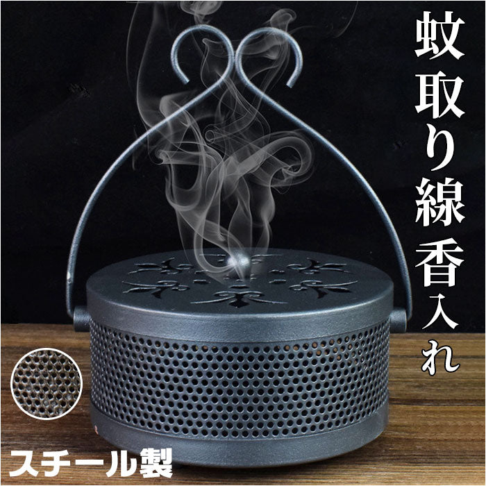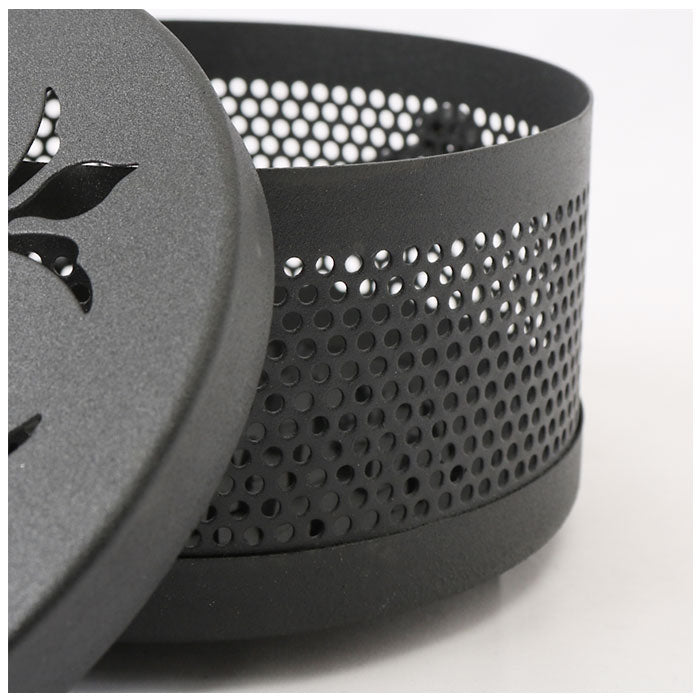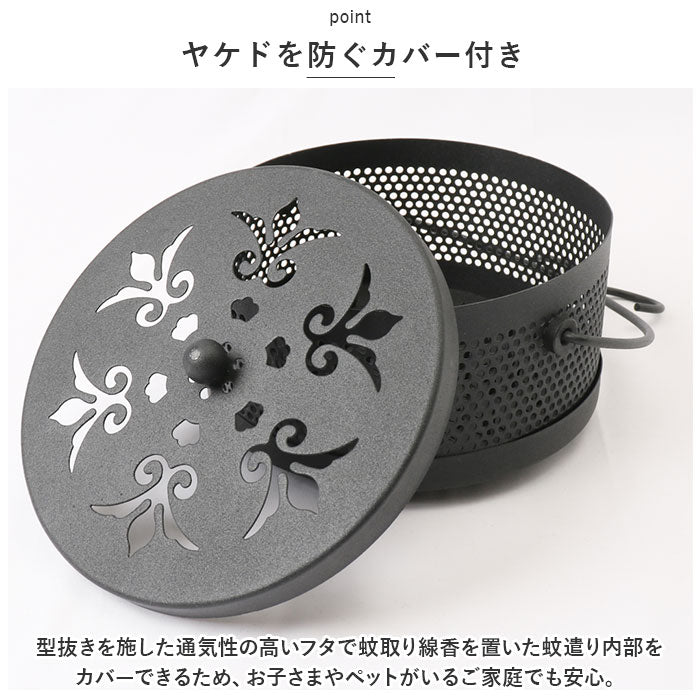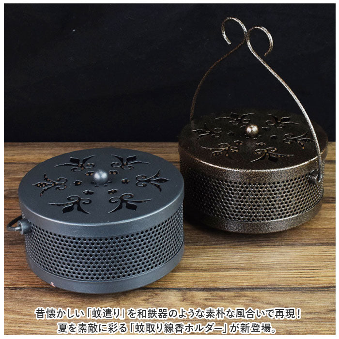 ・和風鉄器のようなざらついたスチール素材表面に、優雅な草の葉紋様の型抜きを施したレトロで存在感のある蚊取り線香ホルダー。
