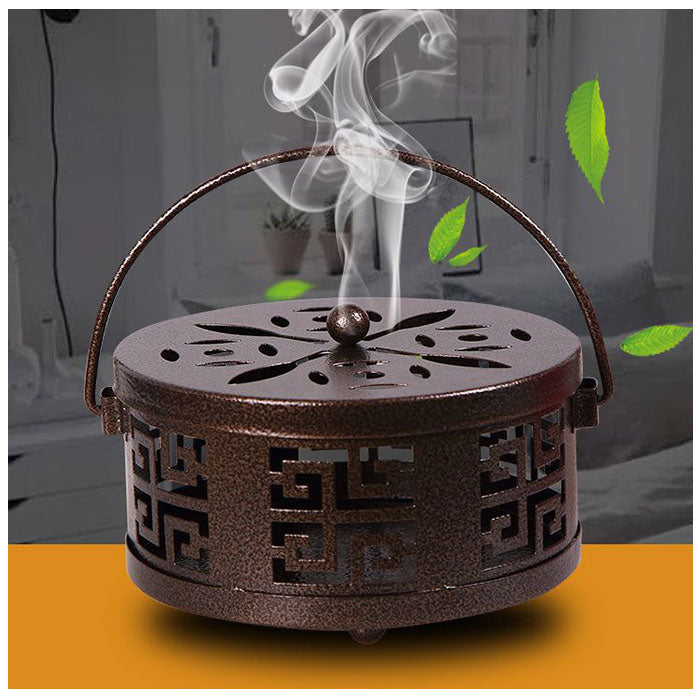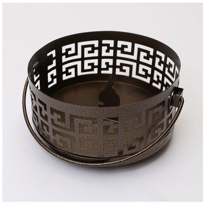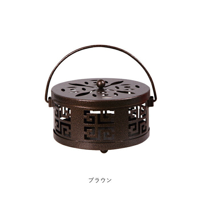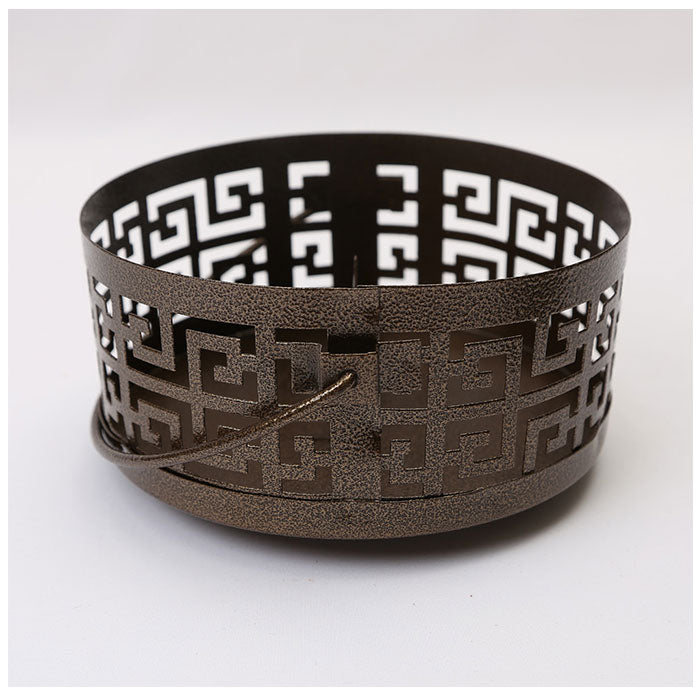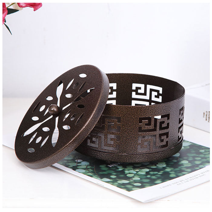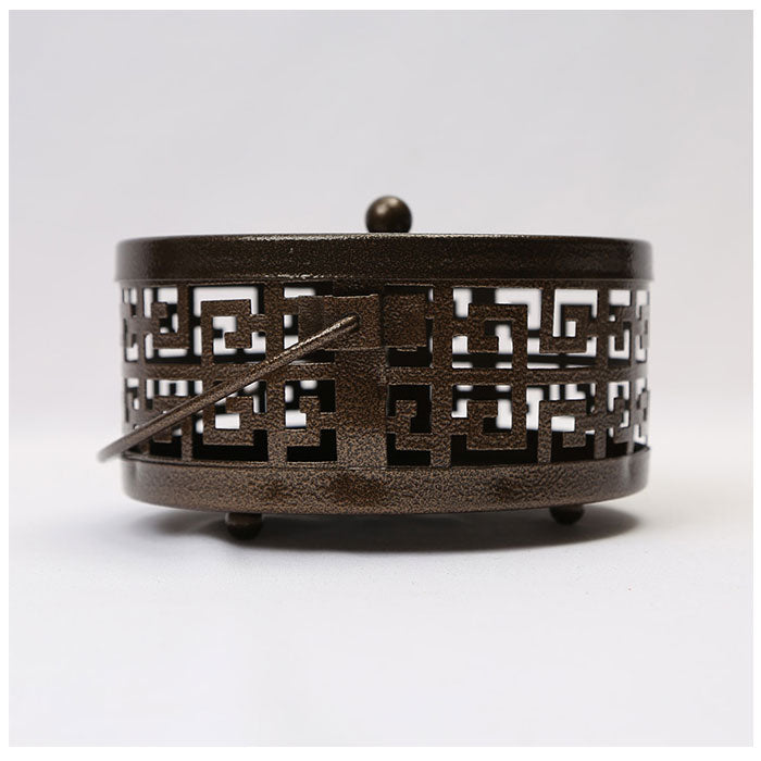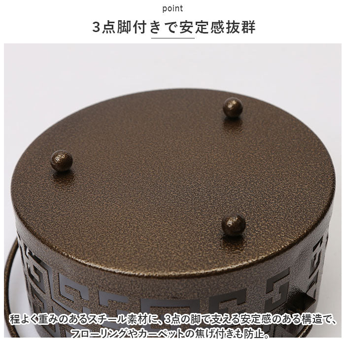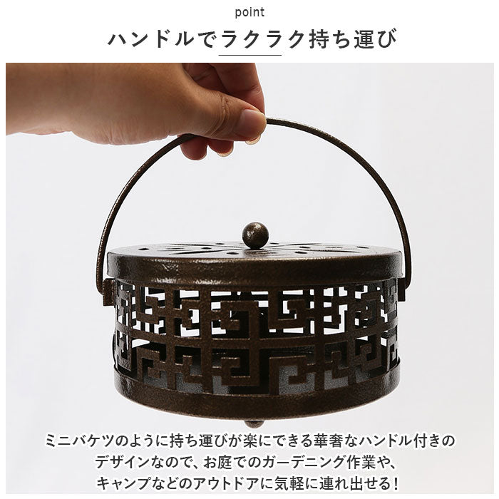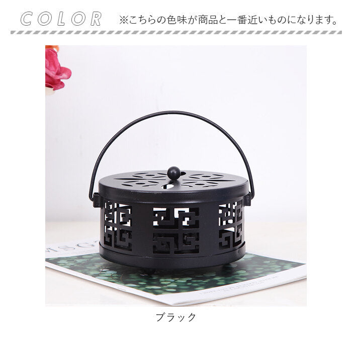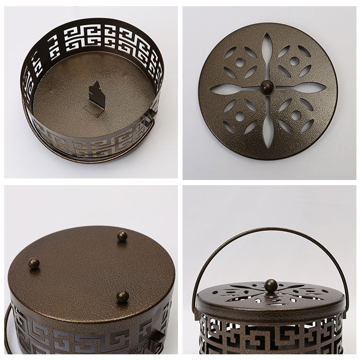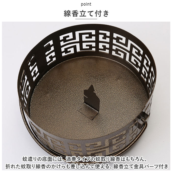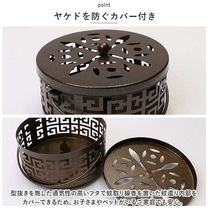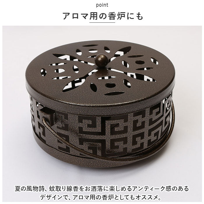 ・和風鉄器のようなざらついたスチール素材表面に、草の葉紋様や、幾何学模様の型抜きを施したレトロで存在感のある蚊取り線香ホルダー。