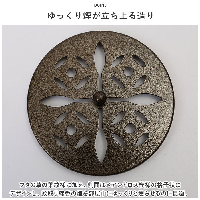 ・フタの草の葉紋様に加え、側面はメアンドロス模様の格子状にデザインし、蚊取り線香の煙を部屋中にゆっくりと燻らせるのに最適。