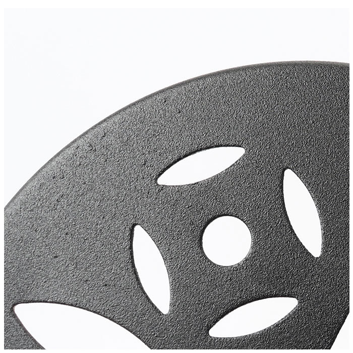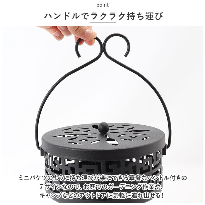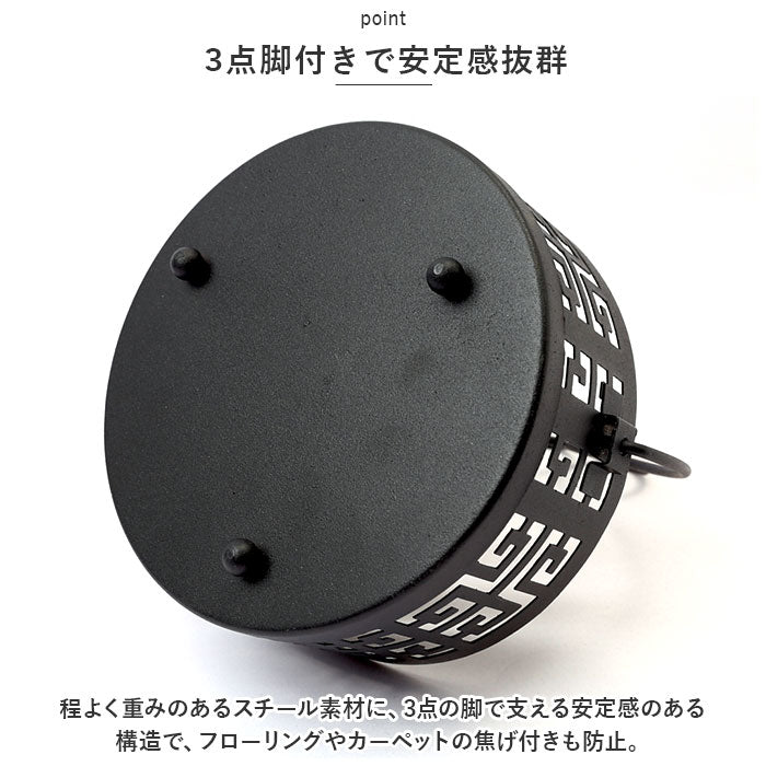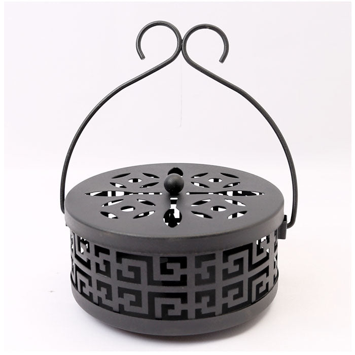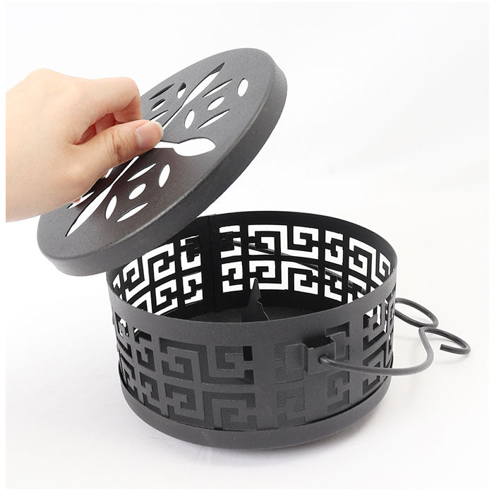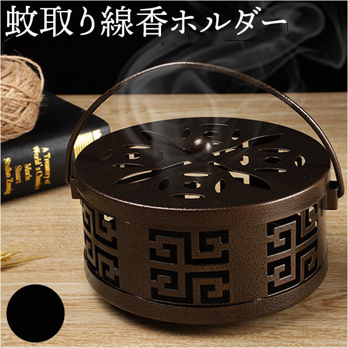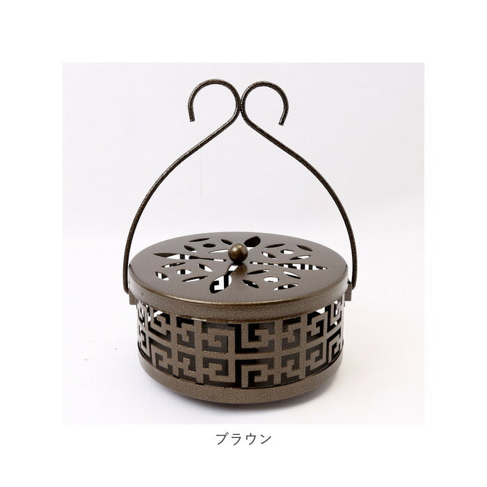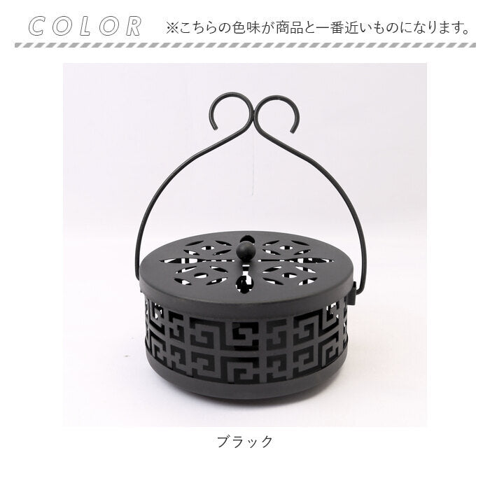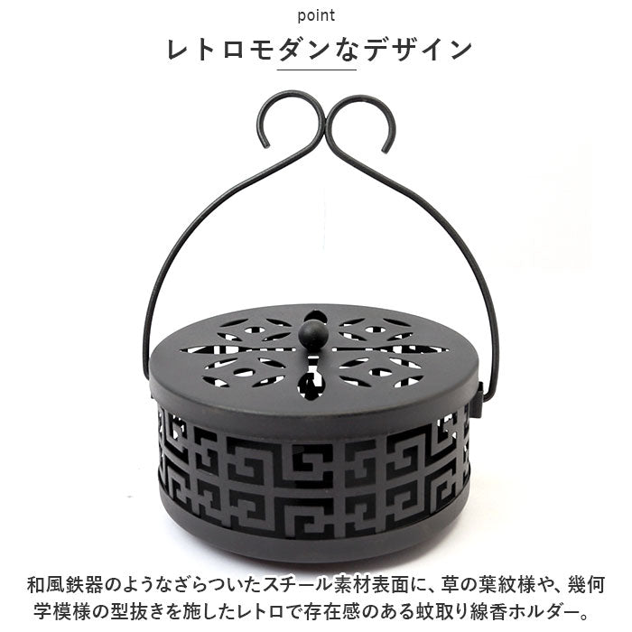 ・和風鉄器のようなざらついたスチール素材表面に、草の葉紋様や、幾何学模様の型抜きを施したレトロで存在感のある蚊取り線香ホルダー。