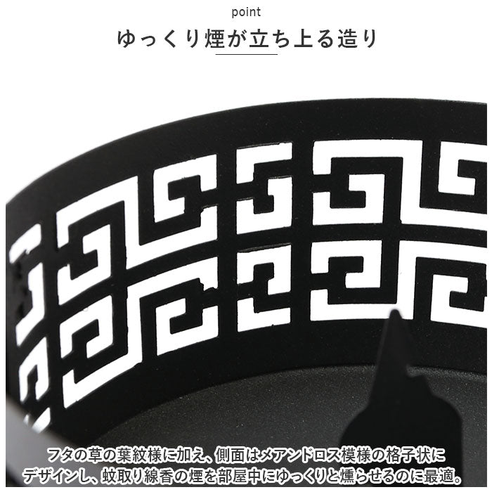 ・フタの草の葉紋様に加え、側面はメアンドロス模様の格子状にデザインし、蚊取り線香の煙を部屋中にゆっくりと燻らせるのに最適。