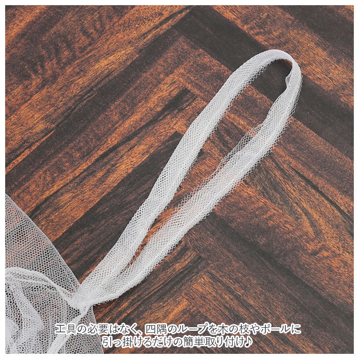 ・工具の必要はなく、四隅のループを木の枝やポールに引っ掛けるだけの簡単取り付け♪