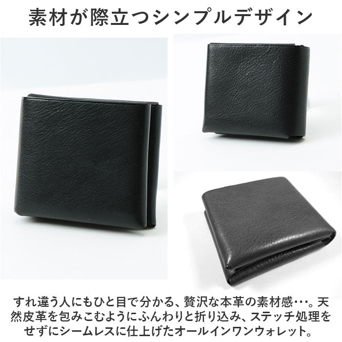 ・すれ違う人にもひと目で分かる、贅沢な本革の素材感・・・。天然皮革を包みこむようにふんわりと折り込み、ステッチ処理をせずにシームレスに仕上げたオールインワンウォレット。