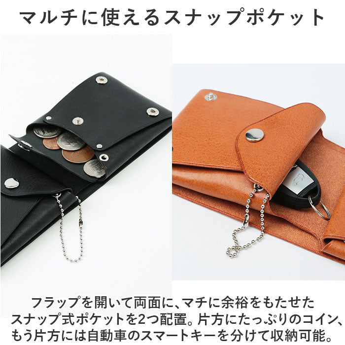 ・フラップを開いて両面に、マチに余裕をもたせたスナップ式ポケットを2つ配置。片方にたっぷりのコイン、もう片方には自動車のスマートキーを分けて収納可能。