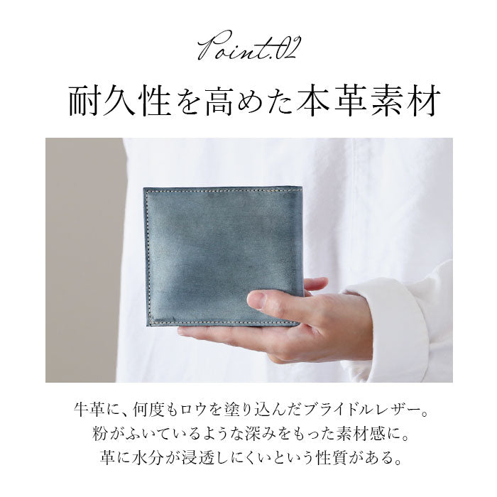 ・ブライドルレザーとは…牛革に、耐久性を高めるために何度もロウを塗り込み、繊維を引き締めている。そのため、表面にはロウが染み出した白い粉がふいているように見えるが、これもブライドルレザーならではの特徴。ロウをしっかりと染み込ませているため、革に水分が浸透しにくいという性質がある。