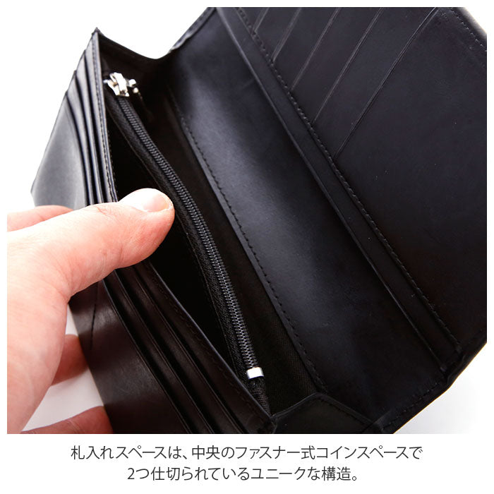 ・札入れスペースは、中央のファスナー式コインスペースで2つ仕切られているユニークな構造。お札を額面ごとに分けたり、レシートを整理して収納するのに便利。