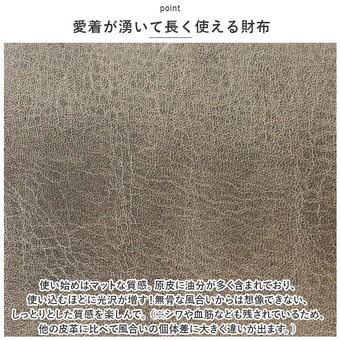 ・使い始めはマットな質感。原皮に油分が多く含まれており、使い込むほどに光沢が増す!無骨な風合いからは想像できない、しっとりとした質感を楽しんで。(※シワや血筋なども残されているため、他の皮革に比べて風合いの個体差に大きく違いが出ます。)