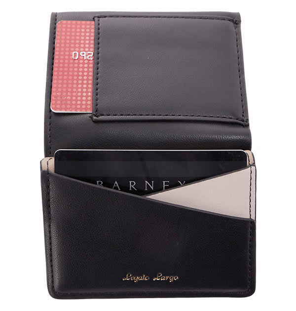 レガートラルゴの3つ折りミニ財布、切り替えのカラーが特徴的な財布です。ミニサイズ、3つ折りなのでポケットやポーチ、バッグなどにさっと入れて扱える大きさ。斜めの切り返しごとにカラーが違うなど、使い勝手とデザインが考えられた作り。小さくてもお札、小銭、カードのポケットや、背面にICカードを入れるポケットがあるなど機能的でコンパクトなお財布です。
