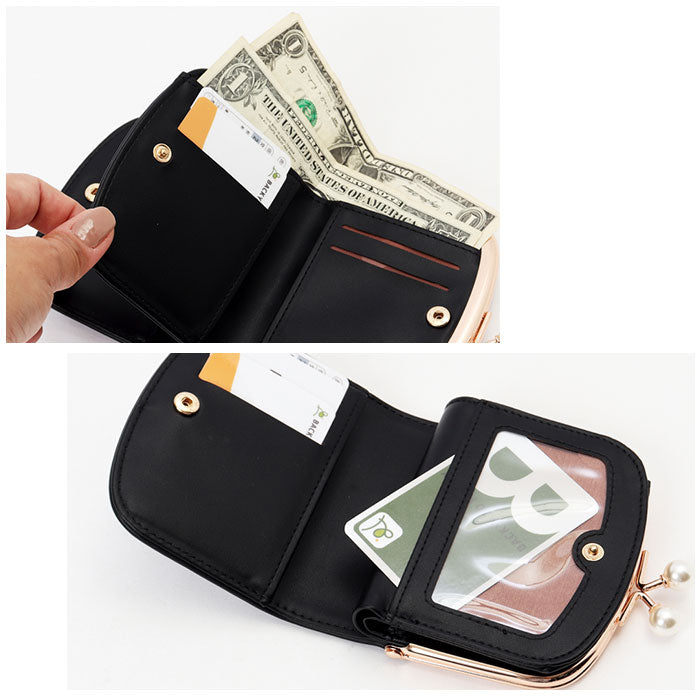・外側に独立した小銭入れは、簡単に開閉できるがま口タイプ。イミテーションパール付きのひねりが、デザインのアクセントに。