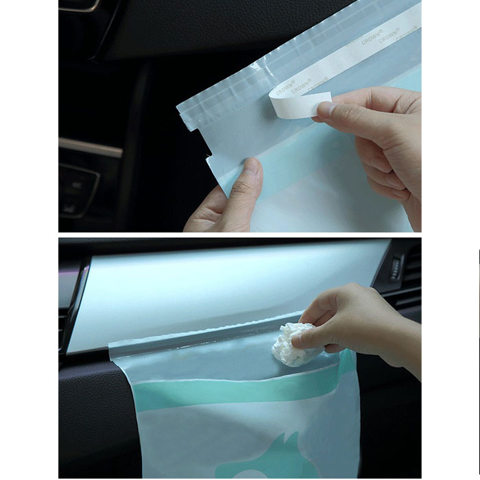 ・テープを剥がし、車内にピタッと貼り付け。ゴミが溜まったら、袋を折りテープで留めればOK。