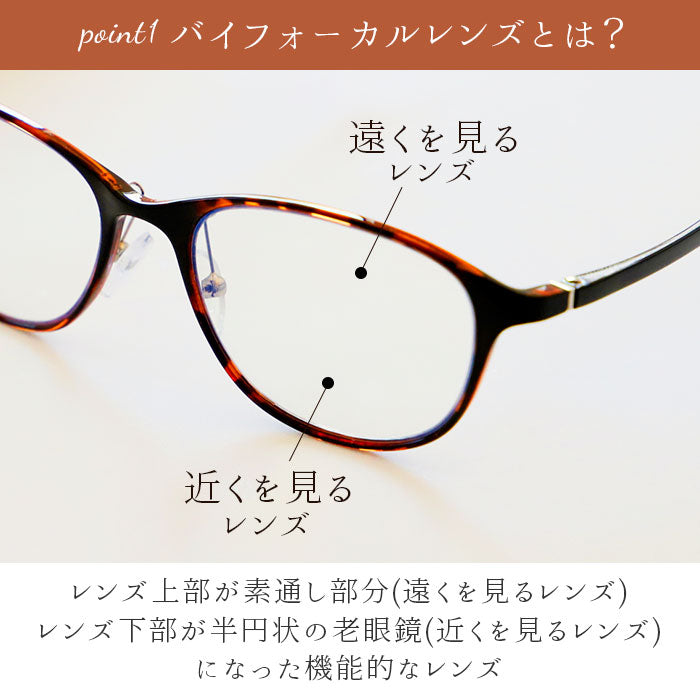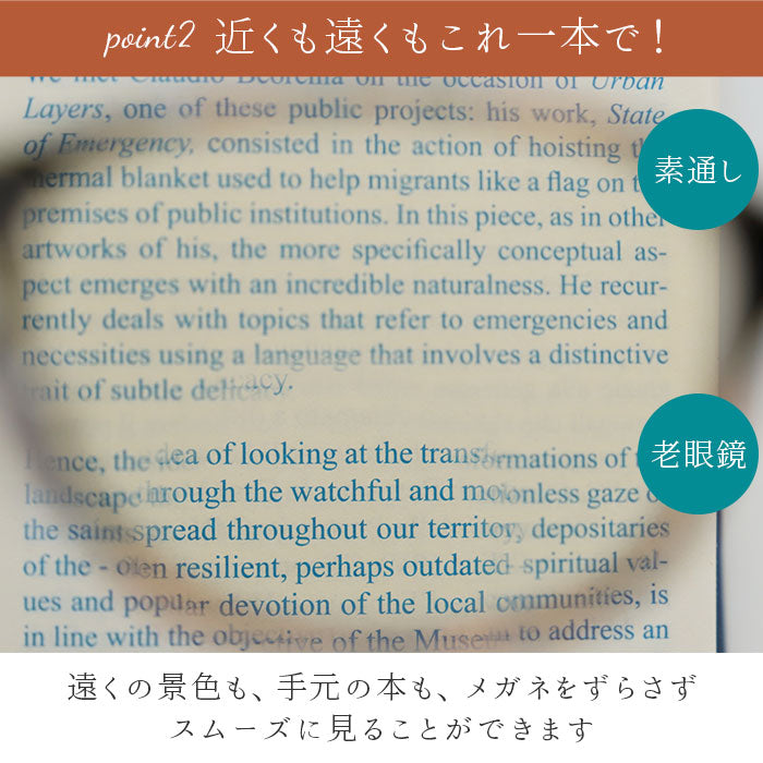 ・遠くを見るレンズと近くを見るレンズを組み合わせた「バイフォーカルレンズ」を採用し、遠くの景色も近くの本もメガネをずらさずにスムーズに見ることができる遠近両用シニアグラス。