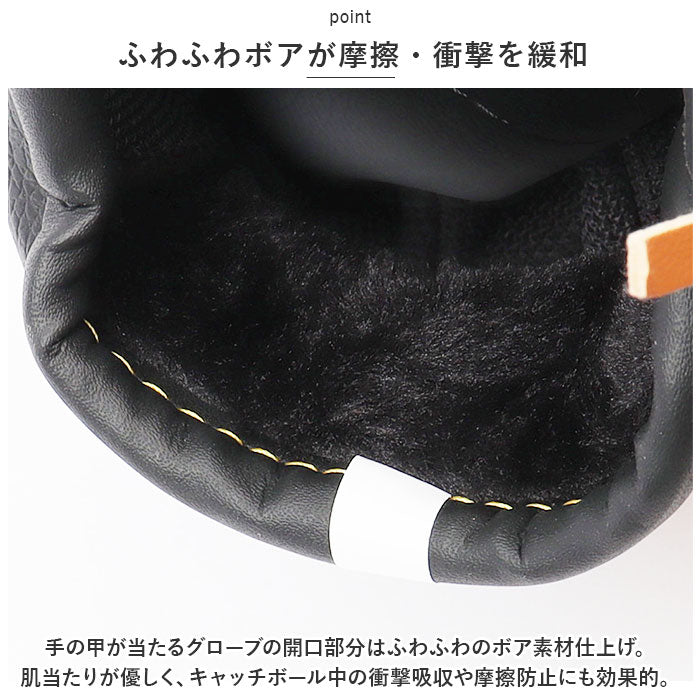 ・手の甲が当たるグローブの開口部分はふわふわのボア素材仕上げ。肌当たりが優しく、キャッチボール中の衝撃吸収や摩擦防止にも効果的。