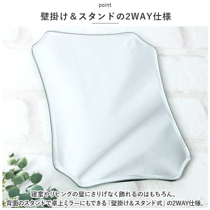 ・寝室やリビングの壁にさりげなく飾れるのはもちろん、背面のスタンドで卓上ミラーにもできる「壁掛け&スタンド式」の2WAY仕様。