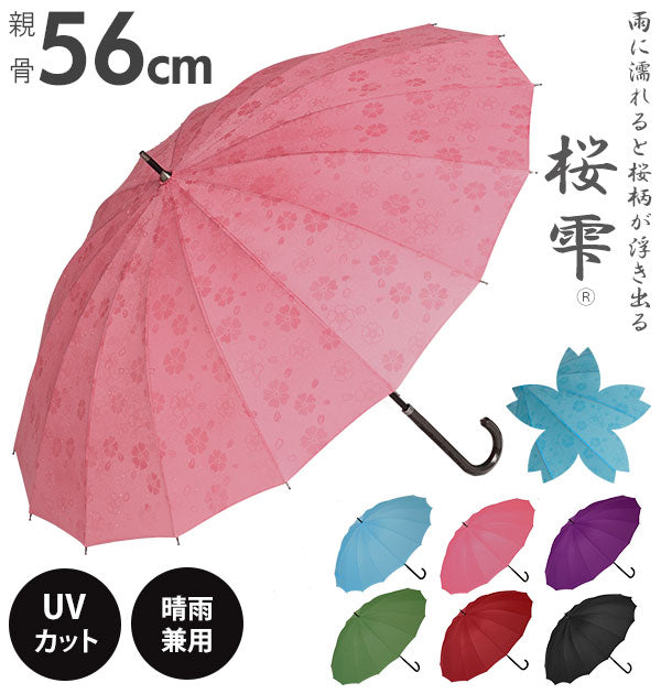 長傘 レディース 16本骨 56cm 桜雫 さくらしずく 通販 雨傘 晴雨兼用 京都花舞妓 手開き 手動 UVカット 日傘 紫外線対策 軽量 軽い 濡れると柄が浮き出る 桜 さくら 花柄 和柄 婦人 女性 無地 シンプル おしゃれ かわいい かさ 傘 カサ アンブレラ パラソル