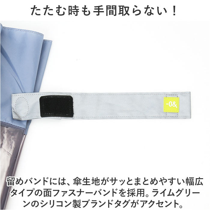 ・留めバンドには、傘生地がサッとまとめやすい幅広タイプの面ファスナーバンドを採用。ライムグリーンのシリコン製ブランドタグがアクセント。