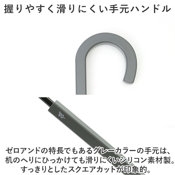 ・ゼロアンドの特長でもあるグレーカラーの手元は、机のへりにひっかけても滑りにくいシリコン素材製。すっきりとしたスクエアカットが印象的。