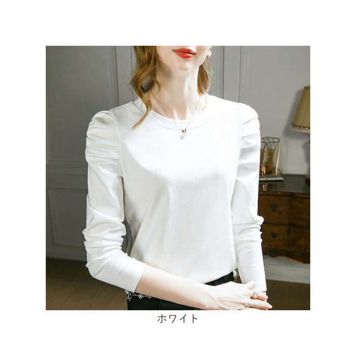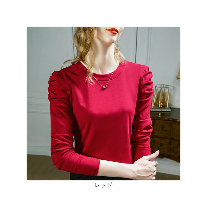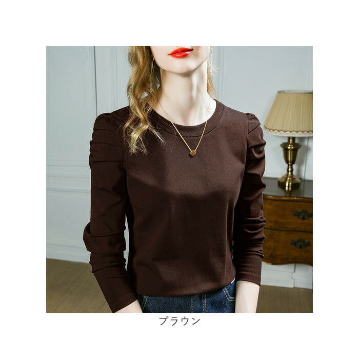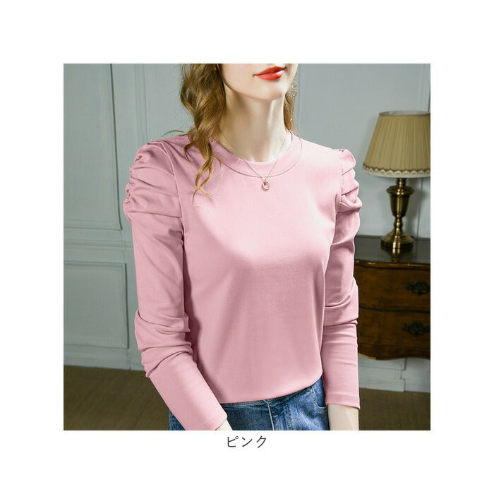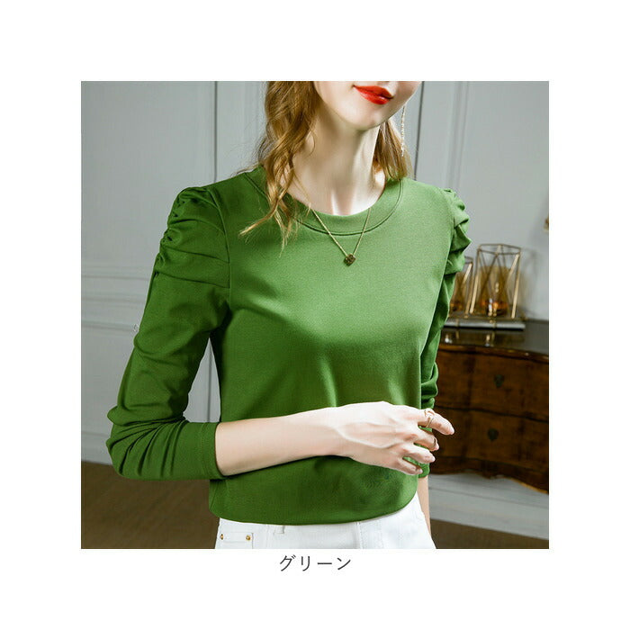長袖tシャツ レディース おしゃれ 通販 トップス ラウンドネック カットソー パフスリープ ロングTシャツ プルオーバー 長袖 ながそで 長袖シャツ シャツ 綿 無地 かわいい