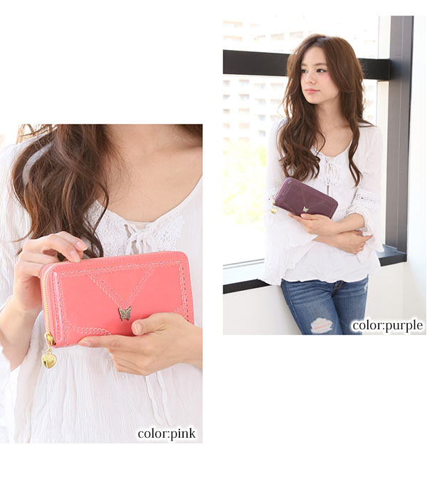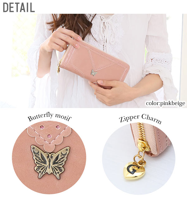 しっとりと柔らかく仕上げられた素材は、色の濃淡が雰囲気をかもしだしてくれます。 L字ウンドファスナー開閉は大きく開いて2層式で、札入れも広めのマチで使いがってもOK! フロントのバタフライモチーフとファスナーの持ち手はアンティーク調に仕上げているので、上品で大人かわいいアクセントになっています。