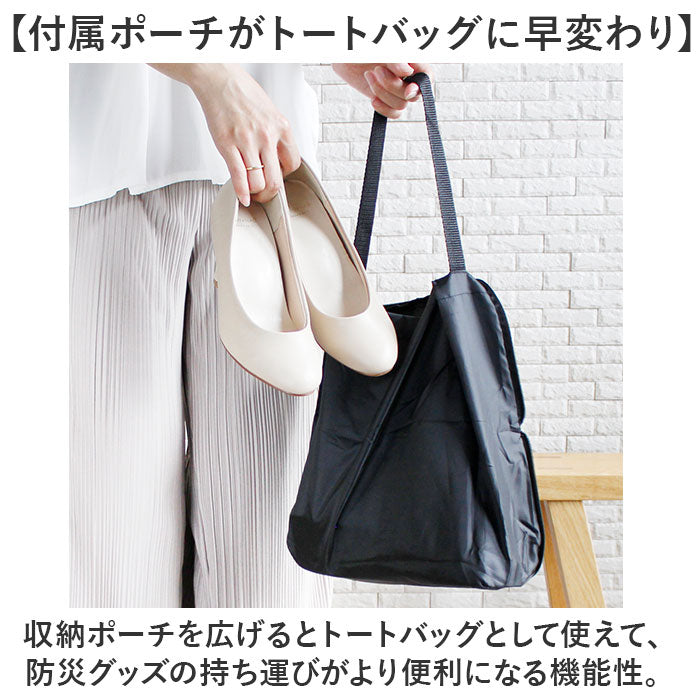 ・収納ポーチを広げるとトートバッグとして使えて、防災グッズの持ち運びがより便利になる機能性