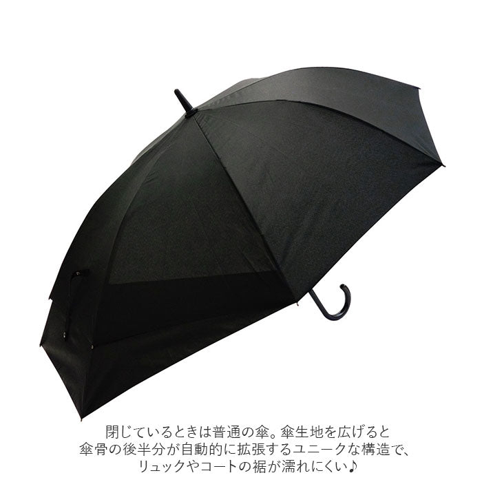 ・閉じているときは普通の傘。傘生地を広げると傘骨の後半分が自動的に拡張するユニークな構造で、リュックやコートの裾が濡れにくい♪