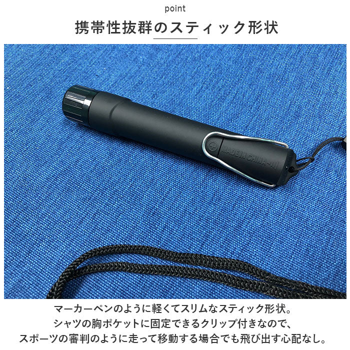 ・マーカーペンのように軽くてスリムなスティック形状。シャツの胸ポケットに固定できるクリップ付きなので、スポーツの審判のように走って移動する場合でも飛び出す心配なし。
