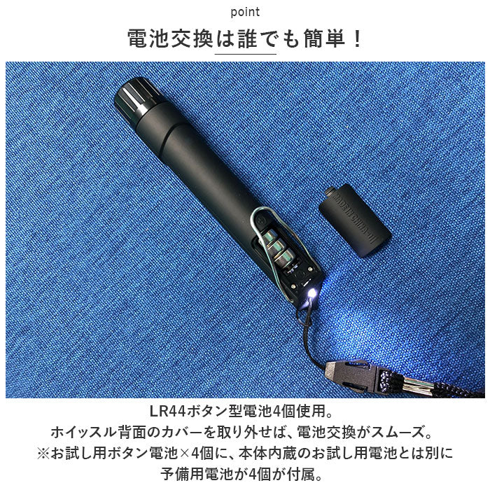 ・LR44ボタン型電池4個使用。ホイッスル背面のカバーを取り外せば、電池交換がスムーズ。(※お試し用ボタン電池×4個に、本体内蔵のお試し用電池とは別に予備用電池が4個が付属。)