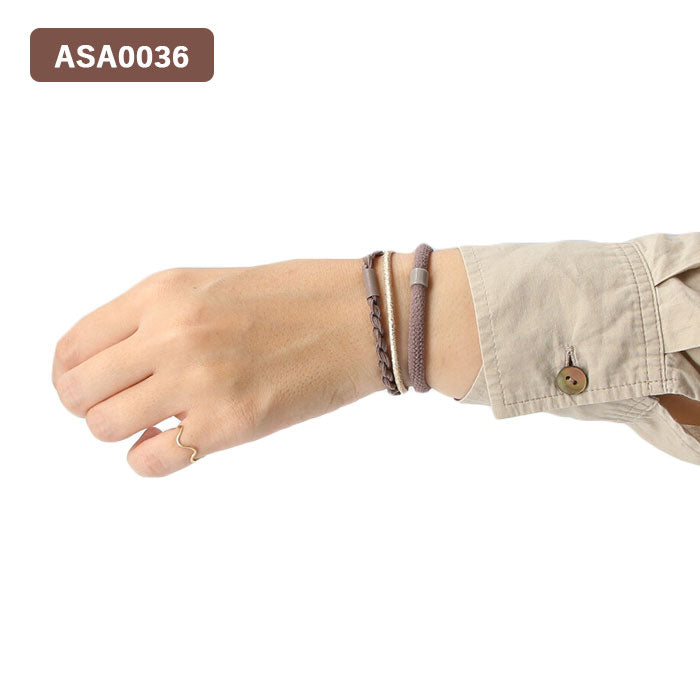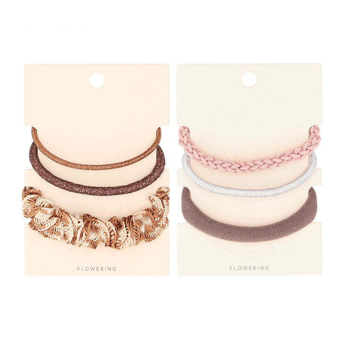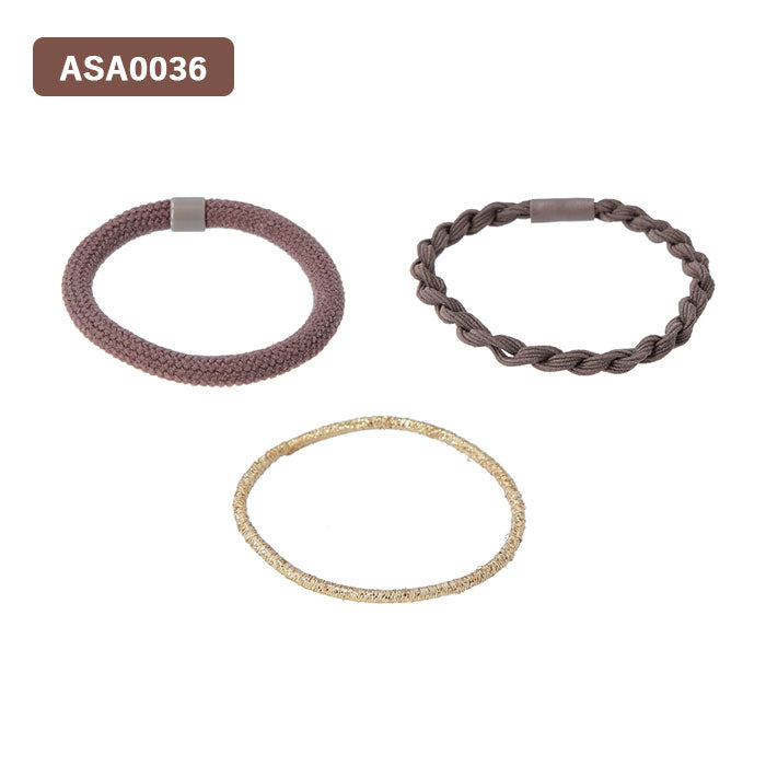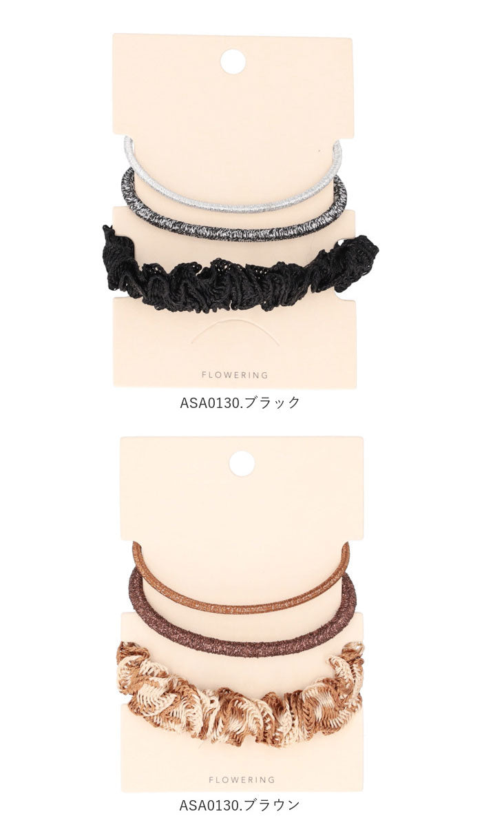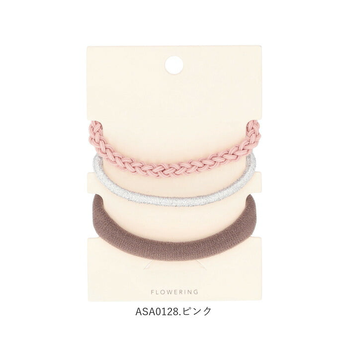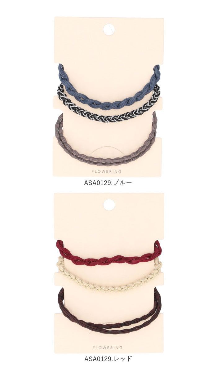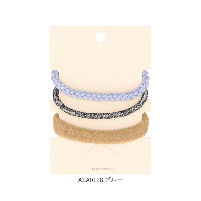 ・それぞれデザインや素材感の異なる、お得な3本セット。(※ASA0036シリーズは、ボリューム感のある太ゴム、ねじりゴム、ラメカラーの3本セット。ASA0037シリーズは、2種類の編み込みゴムと2重ゴムの3本セットになります。)