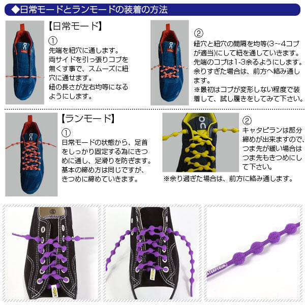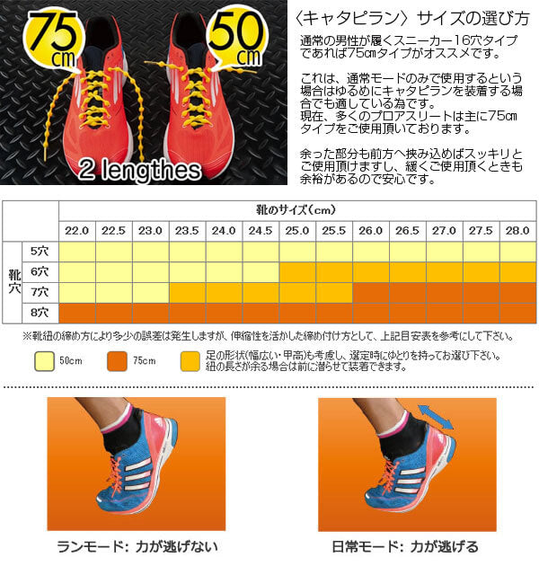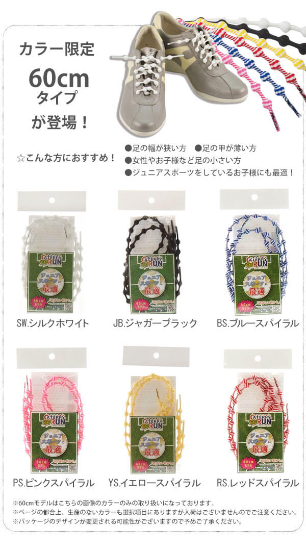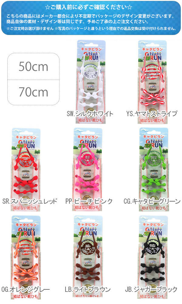 【ブランド名】 CATERPYRUN キャタピラン 【商品名】 むすばない靴ひも 【素材】 ナイロン ゴム アセテート 【生産国】 中国製 【サイズ】 50cm/75cm/60cm 【注意点】 ※カメラやモニターの性質により、画像と実物の色の違いがある場合がございますのでご理解願います。