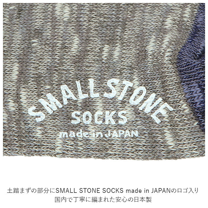 ・土踏まずの部分にSMALL STONE SOCKS made in JAPANのロゴ入り。国内で丁寧に編まれた安心の日本製。