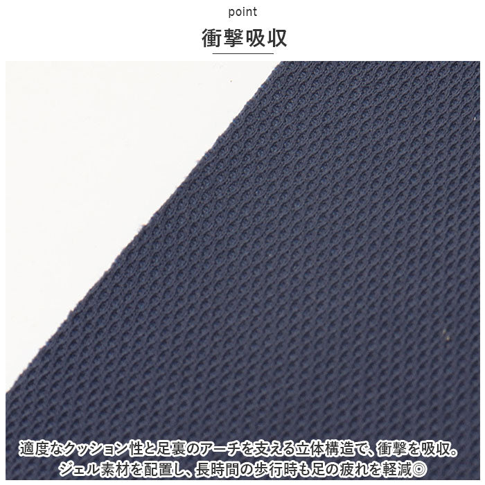 ・適度なクッション性と足裏のアーチを支える立体構造で、衝撃を吸収。ジェル素材を配置し、長時間の歩行時も足の疲れを軽減できるようサポート。