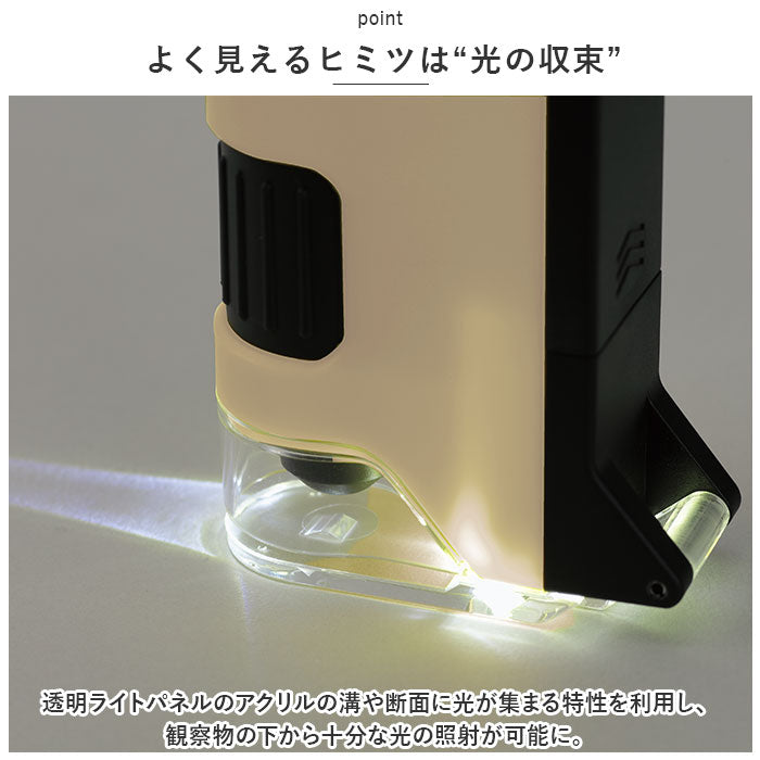 ・透明ライトパネルのアクリルの溝や断面に光が集まる特性を利用し、観察物の下から十分な光の照射が可能に。