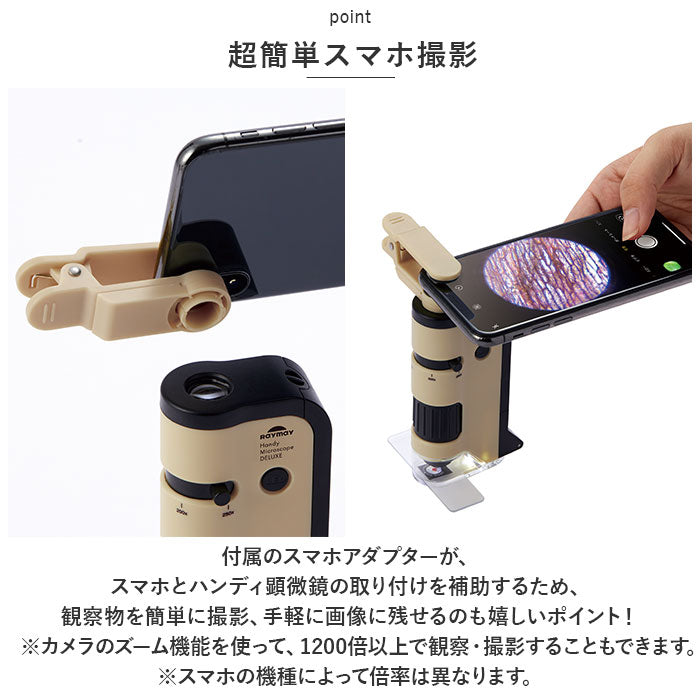 ・付属のスマホアダプターが、スマホとハンディ顕微鏡の取り付けを補助するため、観察物を簡単に撮影、手軽に画像に残せるのも嬉しいポイント!(※カメラのズーム機能を使って、1200倍以上で観察・撮影することもできます。※スマホの機種によって倍率は異なります。)