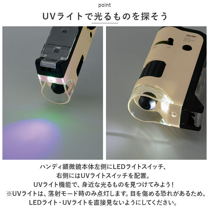 ・ハンディ顕微鏡本体左側にLEDライトスイッチ、右側にはUVライトスイッチを配置。UVライト機能で、身近な光るものを見つけてみよう!(※UVライトは、落射モード時のみ点灯します。目を傷める恐れがあるため、LEDライト・UVライトを直接見ないようにしてください。)