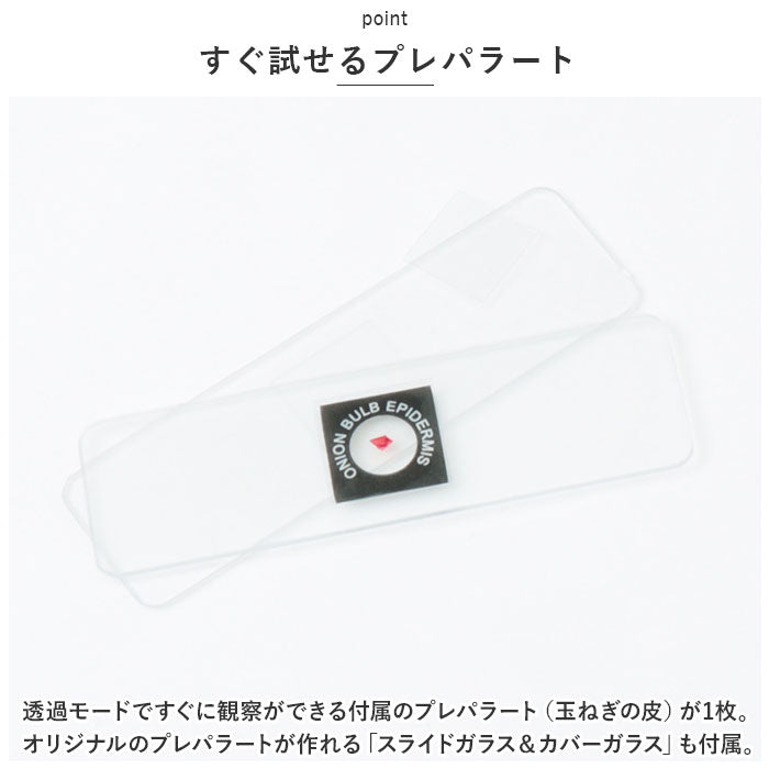 ・透過モードですぐに観察ができる付属のプレパラート(玉ねぎの皮)が1枚。オリジナルのプレパラートが作れる「スライドガラス&カバーガラス」も付属。