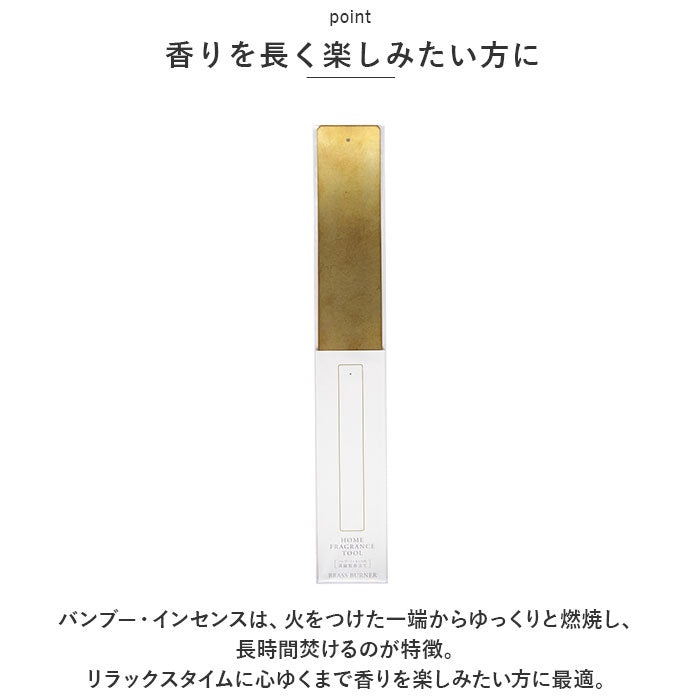 ・バンブー・インセンスは、火をつけた一端からゆっくりと燃焼し、長時間焚けるのが特徴。リラックスタイムに心ゆくまで香りを楽しみたい方に最適。