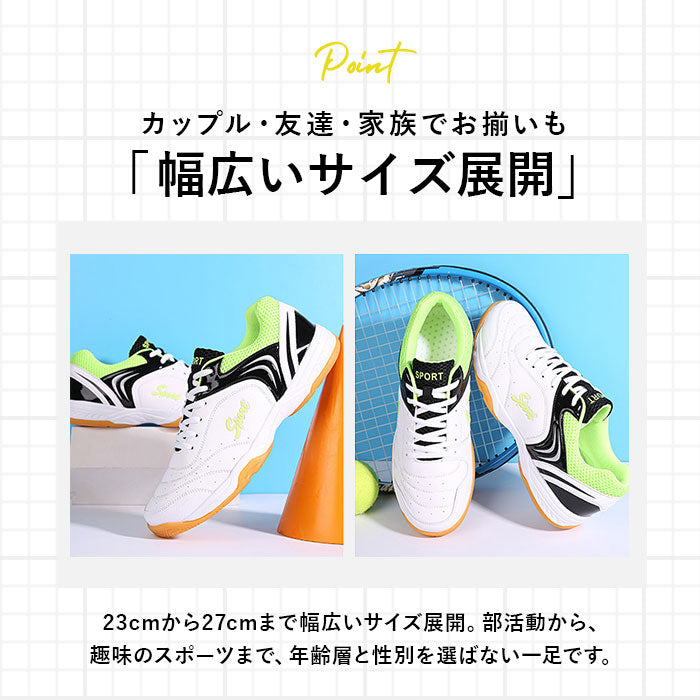 ・テニスやバレーボール、卓球などいろいろなコートで活躍!お子様から大人まで使える「スポーツシューズ」が登場。
