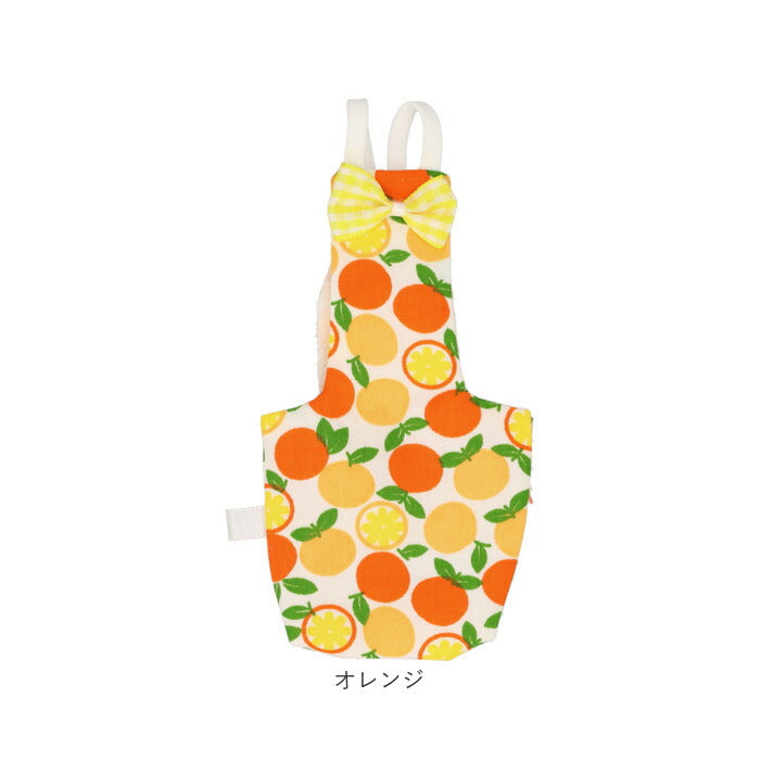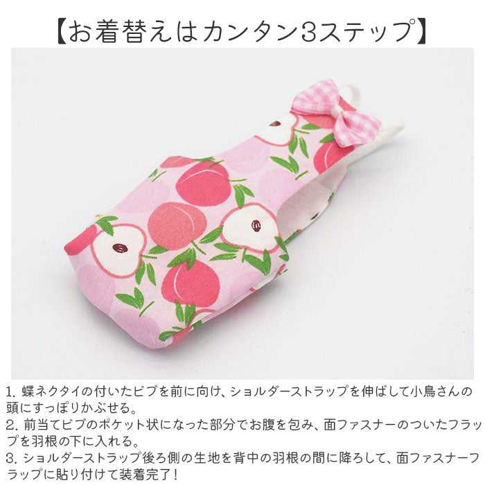 1.蝶ネクタイの付いたビブを前に向け、ショルダーストラップを伸ばして小鳥さんの頭にすっぽりかぶせる。