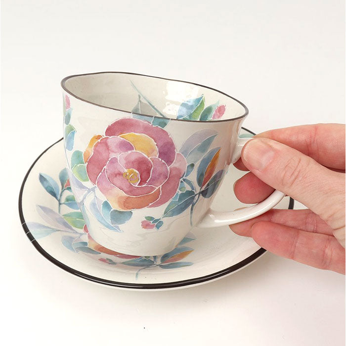 ・季節の花と花ことばを添えた美濃焼のカップ&ソーサーセット。