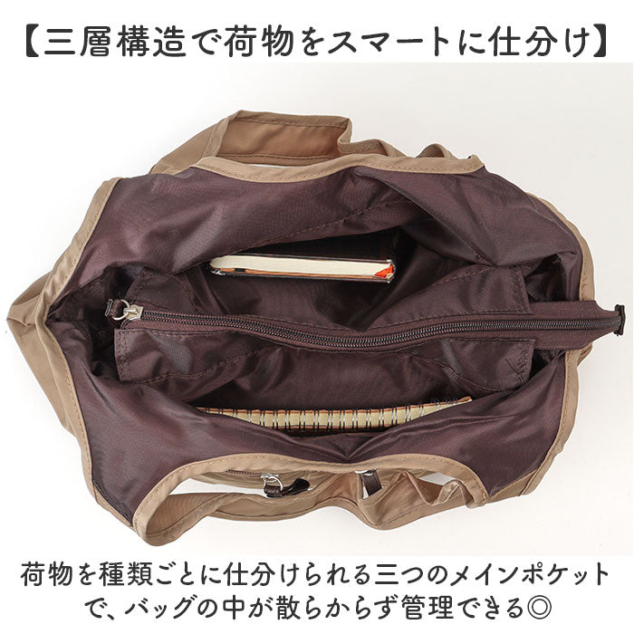 ・荷物を種類ごとに仕分けられる三つのメインポッケトで、バッグの中が散らからず管理できる◎